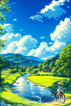 1girl, solo, skirt, hat, flower, outdoors, sky, day, cloud, water, bag, tree, blue sky, grass, ground vehicle, scenery, straw hat, road, river, bicycle, railroad tracks