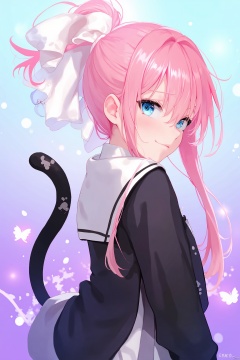 An anime girl with long pink hair and blue eyes. She is wearing a black jacket with a white collar and a white shirt underneath. Her hair is tied up in a ponytail. Her eyes are a piercing blue color. She has a black cat tail on her left side. The cat tail is black and has white spots on it. The background behind her is a light blue and purple color.