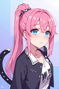 An anime girl with long pink hair and blue eyes. She is wearing a black jacket with a white collar and a white shirt underneath. Her hair is tied up in a ponytail. Her eyes are a piercing blue color. She has a black cat tail on her left side. The cat tail is black and has white spots on it. The background behind her is a light blue and purple color.