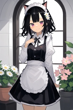 1girl, animal_ear_fluff, animal_ears, apron, bangs, black_flower, black_hair, blue_flower, blush, bouquet, cat_ears, closed_mouth, daisy, door, eyebrows_visible_through_hair, flower, flower_field, hand_on_own_chest, hand_up, holding_bouquet, holding_flower, hydrangea, indoors, juliet_sleeves, lily_\(flower\), long_sleeves, maid, maid_headdress, orange_flower, pink_flower, plant, potted_plant, puffy_sleeves, purple_eyes, purple_flower, red_flower, rose, round_window, shirt, smile, solo, standing, tulip, vase, white_apron, white_flower, white_rose, white_shirt, window, yellow_flower