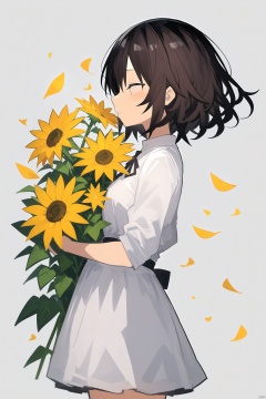 1girl, brown_hair, closed_eyes, dress, flower, from_side, grey_background, holding_flower, leaf, lily_\(flower\), orange_flower, petals, plant, profile, short_hair, solo, sunflower, white_dress, yellow_flower