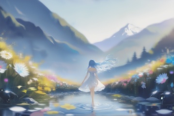 (masterpiece),(best quality),illustration,ultra detailed,hdr,depth of field,(colorful),[artist:wlop],[[artist:sheya]],artist:hiten_(hitenkei),absurdres,4K,extreme detail,panorama,high viewing angle,flower sea plain,colorful flower sea,breeze,a clear stream,shallow stream,mountains in the distance,blue sky shining on the water,rich environmental detailsA girl,blue hair,straight long hair,blue eyes,clear and bright eyes,slender figure,elf earsWearing a white simple dress,off the shoulder,bare_legs,barefoot,Walking in streams,treading water,head_down,light movements,
