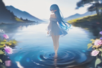(masterpiece),(best quality),illustration,ultra detailed,hdr,depth of field,(colorful),[artist:wlop],[[artist:sheya]],artist:hiten_(hitenkei),absurdres,4K,extreme detail,panorama,high viewing angle,flower sea plain,colorful flower sea,breeze,a clear stream,shallow stream,mountains in the distance,blue sky shining on the water,rich environmental detailsA girl,blue hair,straight long hair,blue eyes,clear and bright eyes,slender figure,elf earsWearing a white simple dress,off the shoulder,bare_legs,barefoot,Walking in streams,treading water,head_down,light movements, <lora:Ayuli2424PDXL32v0.92tx1:0 <lora:Ayuli2424PDXL32v0.92tx1:0.12>