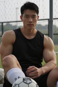 A solo athletic figure sits confidently looking directly at the viewer. His short, black hair is styled neatly, framing his chiseled features. He wears a black shirt with white sports socks and matching shorts, showcasing his toned physique. A fence serves as a subtle backdrop in the outdoor setting, where a soccer ball lies nearby. The strong lighting accentuates the subject's defined muscles, capturing a realistic and bara-inspired scene of a solitary athlete taking a moment to connect with the viewer.