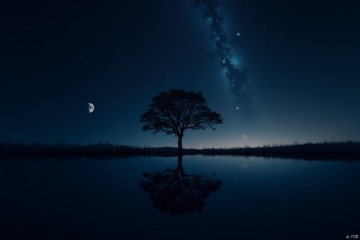 A serene outdoor setting at dusk, with the vast night sky above. The star-studded celestial canvas is reflected perfectly in the calm, dark water below, creating a stunning symmetry. A majestic tree stands tall, its branches stretching towards the moon, while distant planets twinkle like diamonds against the inky blackness.