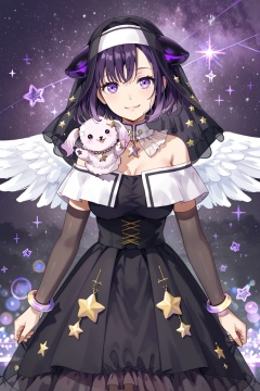 Fuji Miyako,breasts,smile, short hair, bangs, black hair, closed mouth,purple eyes, purple hair,horns, virtual youtuber, star \(symbol\), animal, veil, feathered wings, nun, habit<lora:藤都子:0.8>