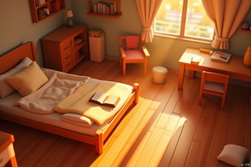3D rendered,A serene indoor scene: a cozy bedroom with a wooden floor, soft-lit by the warm sunlight streaming through the partially opened curtains. A plush pillow rests against the bed's headboard, where a book lies open, abandoned mid-read. Nearby, a chair and table are neatly arranged, while a desk stands opposite, holding a lamp and a bookshelf. In the distance, a trash can sits beside the bed. The wooden floor creaks slightly as the sunlight casts a gentle glow on the peaceful scenery, with a box and shelf adding depth to the 3D rendered space.