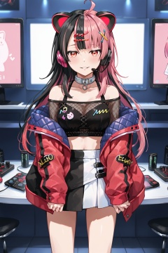 Sengoku Yuno,long hair, breasts,bangs,black hair, hair ornament, red eyes,navel, animal ears,pink hair, multicolored hair,virtual youtuber, two-tone hair,headphones<lora:千石ユノ:0.8>