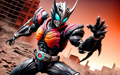 best quality,masterpiece,absurdres,newest,<lora:GENESIS_MK0.2:1>,(dramatic angle,dynamic angle,dynamic pose:1.2),fighting stance, fighting,(bio mecha,rider belt:1.3),(photorealistic, game cg:1.1),(muscle tissue, muscle:0.3), kamen rider mask,(single mechanical arms:1.3),armor,teardrop, (kyoushoku soukou guyver, guyver:0.5),(dirty,dust,old,photo \(medium\):1.2)1boy,no humans, solo, mecha,outdoors,city,building, glowing, standing, red eyes,crazy, horns, claws, glowing eyes, looking at viewer, black mecha body, r,a highly detailed, hyper-realistic cgi (computer-generated imagery) rendering of a humanoid creature with a fantastical, otherworldly appearance, the creature has a muscular, skeletal structure with intricate, leaf-like patterns in shades of red, pink, and orange, the texture of the creature's skin is smooth and glossy, with a slight sheen, indicating a high level of realism, the central body is covered in a complex network of veins and muscles, which are highlighted in vivid shades of pink and black, creating a visually striking contrast against the black and red tones of the body, the figure's head is adorned with a crown-like structure that resembles a dragon's head, with sharp, pointed horns protruding from its forehead, and a pair of small, glowing blue eyes that add a mystical or otherworldly touch, the background is a plain, light gray, ensuring that the focus remains on the creature, the overall style is highly polished and realistic, with meticulous attention to detail in the textures and shading, giving the creature a lifelike quality, ,, ,