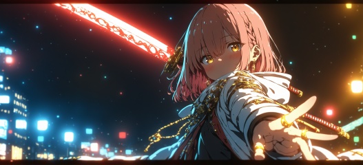best quality,masterpiece,absurdres,newest,<lora:GENESIS_MK0.2:1>,(nj \(annj\):1.3),(high-key lighting, volumetric lighting,light rays,sunlight:1.1)letterboxed, 1girl, weapon, sword, solo, holding, jewelry, holding sword, holding weapon, ring, blush, yellow eyes, braid, earrings, looking at viewer, blurry, katana, blurry background, outdoors, multicolored hair, bangs, depth of field, hair between eyes, night, upper body, hood down, hood, eyebrows visible through hair, long sleeves, glint, shirt, brown hair, covered mouth, jacket, black shirt, pink hair, long hair, medium hair, building, white jacket, brown eyes, virtual youtuber, open clothes, cloak, night sky, foreshortening, outstretched arm,Presenting a young woman of remarkable appearance, she possesses long, straight hair with a gentle wave, and her complexion is fair. Her eyes are a striking yellow, fringed by thick, dark eyelashes, and there is a faint blush on her cheeks, suggesting a sense of shyness or embarrassment. She is grasping a large, elaborate sword with a red hilt, which she is directing towards the viewer with her right hand. Her left hand is embellished with several gold rings, imparting a touch of regal elegance. She dons a white, hooded cloak featuring intricate designs and a high collar, indicating a medieval or fantasy theme. The background is blurred, yet it seems to be a night scene with a dark, starry sky and indistinct, out-of-focus lights, suggesting an urban setting. The overall color palette is dominated by teal and black, along with subtle nuances of red and green, enhancing the dramatic and intense atmosphere. The illustration is highly detailed, with an emphasis on texture and depth, characteristic of high-quality digital art., ,