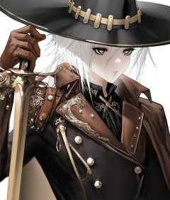 best quality,masterpiece,absurdres,newest,<lora:GENESIS_MK0.2:1>,(quuni:1.2),(agoto:1.25)(omone hokoma agm:0.9),(hyouuma:1.15),a digital drawing in a dark, anime-inspired style, it features a close-up of a male character with pale skin and striking green eyes, holding a large, ornate sword in his right hand, the character has long, flowing white hair that is slightly tousled, and is wearing a black, wide-brimmed hat adorned with small, silver studs, his attire is dark and detailed, with a high collar, a brown leather jacket, and a brown, high-collared shirt, the jacket is adorned with intricate, silver embroidery, and he wears a pair of brown leather gloves that extend to his elbows, the background is a solid black, which contrasts sharply with the character's dark attire, making them stand out vividly, the sword she holds glinting with a bright, white light, suggesting it is a powerful weapon, the overall mood of the drawing is intense and dramatic, with sharp lines and shading that enhance the texture and depth of the artwork