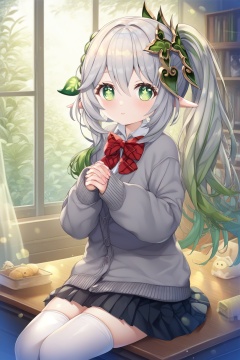 score_9,score_8_up,score_7_up,score_6_up,score_5_up,score_4_up,source_anime,source_cartoon,<lora:nahidaTUPONYXL-000001:1>,nahida \(genshin impact\),+ shaped pupils,1girl,solo,skirt,pointy ears,green eyes,bowtie,multicolored hair,thighhighs,long hair,bow,leaf hair ornament,red bowtie,hair ornament,school uniform,shirt,looking at viewer,red bow,white shirt,long sleeves,pleated skirt,green hair,white thighhighs,sleeves past wrists,black skirt,side ponytail,collared shirt,grey cardigan,desk,cardigan,sitting,indoors,blush,gradient hair,closed mouth,sidelocks,grey hair,window,hair between eyes,white hair,own hands together,zettai ryouiki,colored tips,loli,