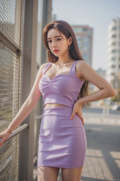 (photorealistic, best quality, ultra high res, extremely detailed eyes and face:1.3),(1girl, solo:1.3),skirt,jewelry,long_hair,necklace,earrings,(pantyhose:1.2),perfect body,standing,medium breasts,upper body,looking at viewer,(wide hips,narrow_waist),dress,outdoors,
