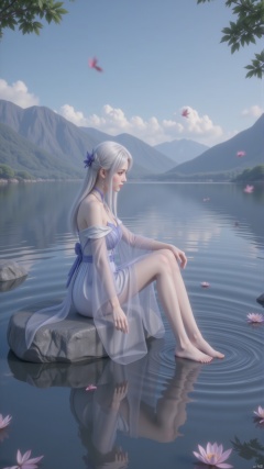 A girl sits on a stone with her back to the audience, washing her feet and partially immersing herself in water with a splashing effect. She has white hair, a white blue dress, necklace, earrings, jewelry, off the shoulder, wide sleeves, bare feet, and a slight smile,