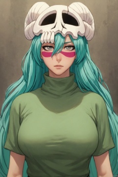 score_9_up,score_8_up,score_7_up,(Clear lines, high definition, Best quality,  masterpiece, 4K),1girl, solo, long hair, breasts, shirt, green hair, grey eyes, green clothes, aqua hair, facial mark, skull, green shirt,Nili Ailu
