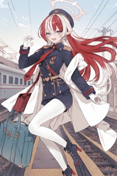 1girl, solo, long hair, looking at viewer, smile, open mouth, blue eyes, gloves, long sleeves, hat, jewelry, white hair, heart, pantyhose, red hair, multicolored hair, earrings, boots, necktie, shorts, teeth, pointy ears, white gloves, bag, uniform, high heels, two-tone hair, fangs, halo, sharp teeth, red necktie, ground vehicle, motor vehicle, white pantyhose, claw pose, train