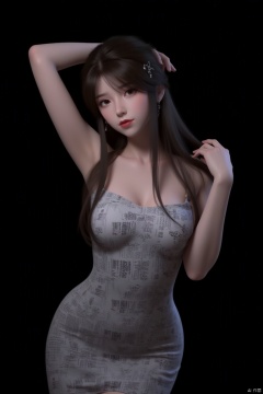 This is a high-resolution portrait of a modern style, featuring a young woman. She is wearing a tight dress printed with English and patterns, the pattern of which resembles a newspaper. Her hair is black, falling over her shoulders, and she has one hand resting on the back of her head while the other hangs naturally by her side. Her eyes are fixed on the camera, and her expression is calm. She appears to be between the ages of 20 and 30, Low cut outfit, medium breast size, slim in figure, with delicate features, and fair skin. Her eyes are brown, and her lips are tinted with a subtle shade of red lipstick. Her hair falls to her shoulders, with a deep brown color, styled in loose waves without bangs. The background is dark, giving a mysterious feel.,1girl