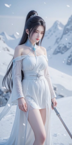 1 girl, half body, solo, long hair, black hair, long black hair, long hair flowing, hair accessories, earrings, white gauze skirt, off-the-shoulder, white heroine hat, heroine hat, snow mountain, snow, closed mouth, smile, charming smile, beautiful legs, plump figure, standing, holding a longsword, sword, snow mountain, snowflake, snowscape, snow, very cold, heavy snow, oversized snowflake, white snowflake, gloomy weather.