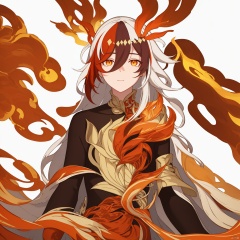 (masterpiece:1.3), (the best quality:1.2), (super fine illustrations:1.2), (Masterpiece), high quality, high detail,(white background:1.2), looking at viewer, (SOLO:1.4),outline,,simple background, white_hair, orange_eyes, streaked_hair, fu hua, orange_hair, fire, fiery_hair, hair_between_eyes, multicolored_hair, fu hua\bengluo, fiery_wings