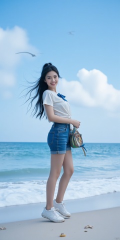 Scene: A vast seaside beach, blue sky and white clouds, crystal clear water, waves gently lapping on the beach, and a few seagulls flying in the distance. There are some shells and starfish on the beach.