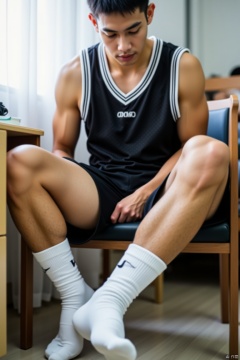 Close-up shot of a young man sitting in a chair, one leg draped over the desk, wearing white athletic socks and a black basketball jersey, set against the backdrop of a student dormitory room. The 35mm film captures a shallow depth of field with creamy bokeh, rendering a professional-grade image with exquisite detail, as if shot on 4K camera. Soft focus highlights the subject's textured skin and fabrics, while the subtle motion blur suggests a moment frozen in time.