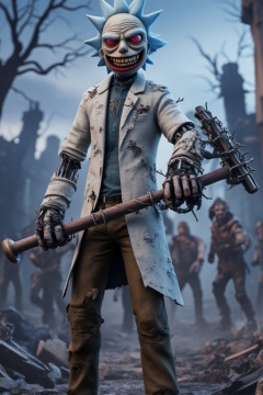 A hyper-realistic 3D rendering of a post-apocalyptic scene featuring Rick, a zombified bionic creation. Rick wears a tattered white coat, blue hair, and worn brown pants. He has a sinister smile and glowing red eyes. Rick holds a menacing iron baton with sharp barbed wires wrapped around the baton. The background is a desolate, bleak landscape with ruined structures and gnarled trees. A horde of zombies runs after Rick. The artist masterfully manipulates light and shadow, accentuating contrasting colors and elements.,Vshorror