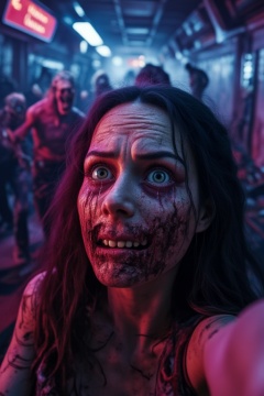 A cinematic medium shot of a woman with a deeply scarred face taking a selfie in an abandoned, dimly lit subway station. The flickering neon lights cast an eerie glow, accentuating the decay and desolation of the surroundings. The woman is running from danger, with tears streaming down her face, signaling her desperate cry for help. The background reveals a horde of grotesque and decaying zombies that pursue her relentlessly. The overall atmosphere is one of despair and dread, with vibrant colors and intense emotions creating a haunting and unforgettable visual experience. Lighting and shadows create a vibrant atmosphere. The close-up captures the intricate details of her facial features. High-contrast lighting accentuates your eyes.Professional DSLR lighting and shadows,Vshorror