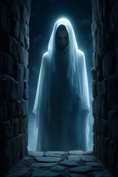 A dark fantasy cinematic shot of a ghostly figure shrouded in an ethereal cloak. The figure is peeking out from a narrow window in an ancient stone structure. The cloak emits a pale, translucent glow. The background is dark and shadowy. The ground below is made of worn stone tiles. The atmosphere of the image is mysterious and suspenseful. The lighting and shadows create a vibrant atmosphere. The close-up shot captures the intricate details of the figure's facial features. The high-contrast lighting emphasizes the figure's eyes.,Vshorror