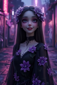 A cinematic medium shot of a stunning anime-style gothic girl in an urban setting. She wears a black dress adorned with intricate purple flower patterns, giving it a fashionable and mysterious edge. Her long, straight hair frames her face, which is framed with silver flowers. Her eyes sparkle with happiness, and her smile is both playful and enchanting. The background is a dark, cityscape with graffiti-filled walls and vibrant neon lights, creating a perfect contrast to the character's elegant outfit.A iluminação e as sombras criam uma atmosfera vibrante. O close-up captura os detalhes intrincados de suas características faciais. A iluminação de alto contraste acentua seus olhos.Iluminação e sombras DSLR profissionais,Vshorror
