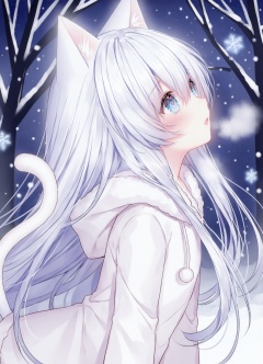 masterpiece, best_quality,high_quality,guo jiang mullay, loli,chen_bin,heart-shaped eyes,onineko,1girl, animal ears, tail, blue eyes, solo, cat tail, cat ears, cat girl, white hair, hood, long hair, animal ear fluff, hood down, outdoors, snow, blush, parted lips, upper body, tree, snowing, winter, snowflakes, fur trim, breath, looking up, hooded jacket, from side<lora:guo_jiang-R2-lokr-f4-000040:0.85>