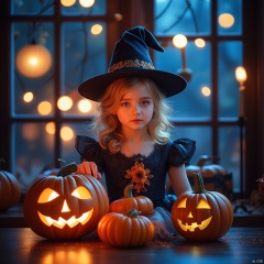 Halloween,1girl,solo,blue eyes,blonde hair,hat,dress,sitting,pointy ears,indoors,window,witch hat,drill hair,realistic,jack-o'-lantern,pumpkin,pumpkin lantern,Felt style,hat_(hat),