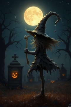 A lone figure stands beneath the glowing light of a full moon, her long hair blowing gently in the night breeze. She wears a pointed witch's hat and black gloves, torn clothing clinging to her lithe form. A staff in hand, she gazes out at a bare tree, where a jack-o'-lantern glows like an eerie lantern. In the distance, a tombstone bears an inscription that seems to pulse with an otherworldly energy. Her eyes aglow, she casts a spell under the watchful gaze of the moon.