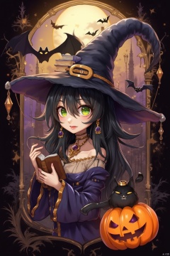 1girl, solo, long hair, looking at viewer, black hair, hat, holding, jewelry, green eyes, upper body, earrings, detached sleeves, lips, book, witch hat, animal, moon, cat, full moon, halloween, jack-o'-lantern, on head, witch, pumpkin, bat \(animal\), animal on head, black cat, book stack, cat on head