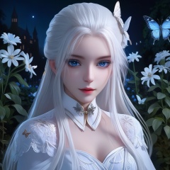 <lora:832-DA-XL-少年白马醉春风-晏琉璃-白衣:0.8>, (masterpiece),(best quality),night,glowing eyes,gothic,long dress, 1 girl, solo, long white hair, blue eyes, detailed eyes, blink and youll miss it detail,butterfly, flower garden, high quality, floral background, very detailed,off shoulde