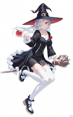 An animated image of a woman in a black dress and a black hat. The woman is riding a broomstick and a red apple in her hands. Her boots are black and white. The background is white.