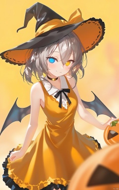 An animated image of a girl in a yellow dress with a black hat on her head. The girl has blue eyes and a black bow on her dress. There are pumpkins on the right and left side of the image. There is a yellow background behind the girl.