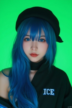 a girl with long blue hair, wearing a black hat with a blue ribbon around the brim and a black band. She is dressed in a black and blue outfit with a white patch on the chest that reads "ICE" in white letters. Her eyes are a piercing blue, and her hair is a vibrant shade of blue. Her hair is tied in a ponytail, adding a pop of color to the scene. The backdrop is a stark green, creating a striking contrast to her outfit.