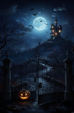 The image is a Halloween scene with a full moon in the background. The sky is dark and filled with stars, and there are bats flying around the moon. In the foreground, there is a gate with a jack-o-lantern hanging from it. The gate is made of metal and has a wrought iron railing. Behind the gate, there are trees with bare branches, and a hill with a castle-like structure on top. The castle is lit up with orange and yellow lights, creating a spooky atmosphere. The overall mood of the image is eerie and eerie.
