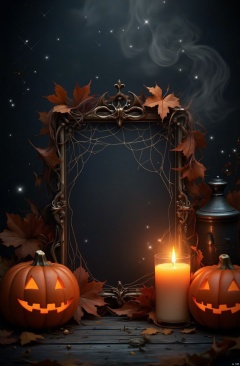 The image is a Halloween-themed background with a dark and eerie atmosphere. In the center of the image, there is a large, ornate frame with a spider web design on it. The frame is placed on a wooden surface with two carved pumpkins on either side. The pumpkins have jack-o-lantern faces carved into them and are surrounded by autumn leaves. On the right side of the frame, there are two lit candles with orange flames. The background is filled with stars and smoke, creating a spooky and eerie ambiance. The overall color scheme is dark and moody, evoking the feeling of Halloween.