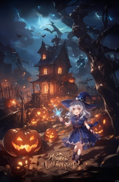 In the foreground, a young girl dressed in a blue witch costume with a short skirt stands in front of the house. She has white hair, possibly in pigtails or waves, and holds a sparkling magic wand, her face lit up with excitement. The words 'Happy Halloween' are written in a cursive font at the bottom of the illustration.