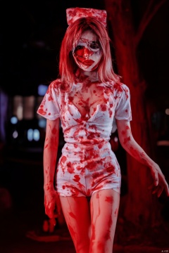 a zombie is captured in a vibrant red and white photo. The zombie is dressed in a white t-shirt and white shorts, adorned with red splotches of blood. His arms are stretched out to the sides, adding a touch of balance to the scene. The background is a stark black, creating a stark contrast to the zombie's costume. To the right of the zombie, a person's hand can be seen.