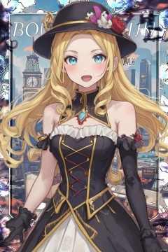 1girl,banner,bare shoulders,black gloves,black hat,blonde hair,blue eyes,building,city,clock tower,detached sleeves,dress,drill hair,drill sidelocks,flower,gloves,hat,hat flower,jewelry,long hair,open mouth,scenery,sidelocks,smile,solo,steampunk,tower,very long hair,