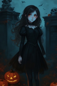 A mysterious evening unfolds as a single girl, dressed in dark attire, stands amidst a graveyard backdrop. A glowing jack-o'-lantern casts an eerie light on her pale skin, while a decorative skull sits atop a nearby mausoleum. The air is thick with the spirit of Halloween, and the girl's eyes seem to hold a hint of vampiric allure.