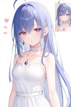 1girl, solo, long hair, looking at viewer, bangs, dress, jewelry, blue hair, earrings, necklace, white dress, reference inset, photo inset