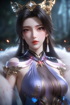 1girl, solo, long hair, breasts, looking at viewer, black hair, dress, bare shoulders, brown eyes, medium breasts, upper body, parted lips, lips, fur collar,