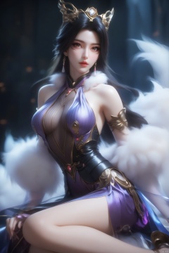 1girl, solo, long hair, breasts, looking at viewer, black hair, dress, bare shoulders, brown eyes, medium breasts, full body, parted lips, lips, fur collar,