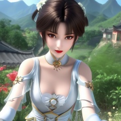 <lora:834-DA-XL-诛仙-碧瑶:0.8>, score_9, score_8_up, score_7_up, realistic:2, photorealistic:2, realistic detailed skin:2, realistic detailed face:2, perfect eyes:2, realistic detailed background, uncensored, BREAK, 1girl,  , brown hair, short hair, flipped hair:1.5, red eyes, red lips, looking at viewer, seductive smile, china dress, white dress, cleavage cutout, skintight, shiny clothes, elbow gloves, black thighhighs, garter belt, garter straps, thong, pelvic curtain, outdoors, cowboy shot,