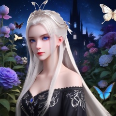<lora:835-DA-XL-晏琉璃-婚服:0.8>, (masterpiece),(best quality),night,glowing eyes,gothic,long dress, 1 girl, solo, long white hair, blue eyes, detailed eyes, blink and youll miss it detail,butterfly, flower garden, high quality, floral background, very detailed,off shoulde