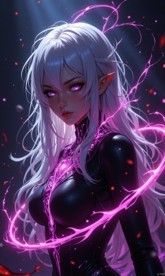 A masterfully crafted masterpiece, bathed in cinematic light, showcases a lone, ethereal beauty hubggirl with snow-white locks cascading between her piercing purple eyes. Her sharp features are illuminated by an extremely delicate and beautiful glow, casting a warm contrast against the dark fantasy background. Swirling black particles dance around her, as if conjured from the very fabric of magic. A dynamic angle captures her profile, with blood splatter and shattered glass fragments scattered, while a glowing magic circle surrounds her, drawing the viewer's gaze into this hyper-detailed, high-contrast world.