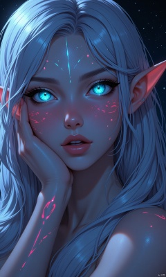 Create a close-up image of a fantasy elf’s face. Her skin glows with a soft, ethereal light and is adorned with neon tattoos that cover her face in intricate patterns. The tattoos emit a magical glow that illuminates her delicate features. Her eyes are large and bright, subtly changing between shades of blue and green, as if holding an ocean within them. Her long, silver hair frames her face, adding a touch of magic to the scene. The background features a starry sky that enhances the dreamy atmosphere , fantasy art, detail eyes, magic eyes, anime style
